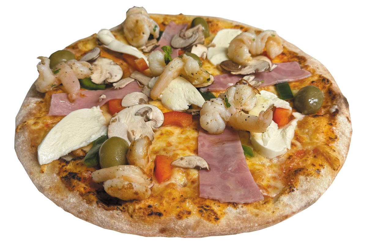mit Tomatensauce, Käse, Garnelen, Truthahnschinken, frischen Champignons, gr. Paprika, gr. Oliven, Mozzarella, Knoblauch und Oregano