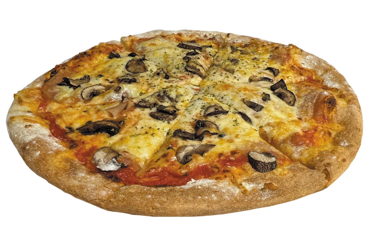 mit Tomatensauce, Käse, Truthahnsalami, Truthahnschinken, frischen Champignons und Oregano